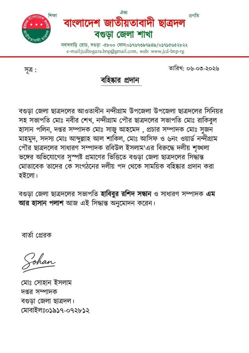 জানা গেছে, দলীয় শৃঙ্খলা ভঙ্গের অভিযোগের সুস্পষ্ট প্রমাণের ভিত্তিতে বগুড়া জেলা ছাত্রদলের সিদ্ধান্ত অনুযায়ী তাদের বিরুদ্ধে এই সাংগঠনিক ব্যবস্থা নেওয়া হয়েছে।
