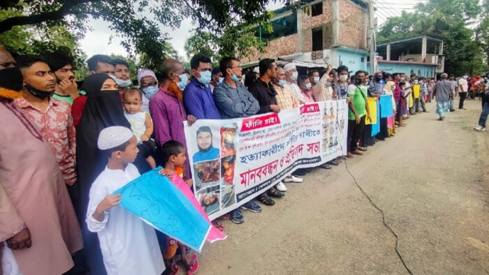 মানববন্ধন ও বিক্ষোভ সমাবেশে রকির স্ত্রী বলেন, আমাদেরকে মারবে না এই গ্যারান্টি এখন কে দিবে এখন, আমার এই তিন সন্তান নিয়ে এখন আমি কোথায় যাবো।