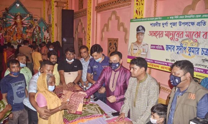 বস্ত্র বিতরণ শেষে দূর্জয় ক্লাব আয়োজিত দুর্গাপূজার অঞ্জলিতে অংশ নেন পুলিশ সুপার সুদীপ কুমার চক্রবর্ত্তী সহ পূজা উদযাপন পরিষদের নেতৃবৃন্দ। এসময় তিন শতাধিক মানুষের মাঝে দুর্গাপূজা উপলক্ষে বস্ত্র বিতরণ করা হয়।