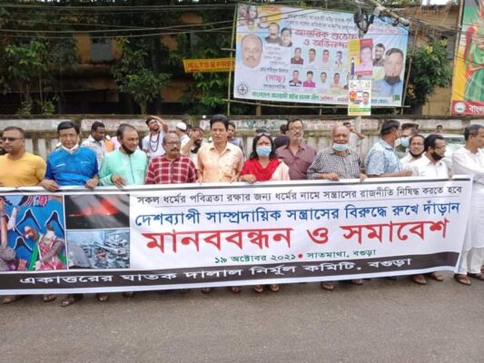 শারদীয় দুর্গা পূজায় মৌলবাদী গোষ্ঠী কর্তৃক ষড়যন্ত্রমূলক নাটকীয় ধর্ম অবমাননার ইস্যু সৃষ্টি করে দেশব্যাপী সাম্প্রদায়িক সন্ত্রাসের প্রতিবাদে মঙ্গলবার (১৯ অক্টোবর) বগুড়ায় একাত্তরের ঘাতক দালাল নির্মূল কমিটির মানববন্ধন ও সমাবেশ অনুষ্ঠিত হয়।