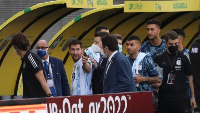 ব্রাজিল ও আর্জেন্টিনার খেলোয়াড়রা স্বাস্থ্য কর্মকর্তাদের ঘিরে ধরার পর তারা কথা বলেন মেসি ও নেইমারের সঙ্গে। সেখানে সমস্যার সমাধান না হওয়ায় রেফারি কোপা আমেরিকার চ্যাম্পিয়নদের ড্রেসিং রুমে পাঠিয়ে দেয়।