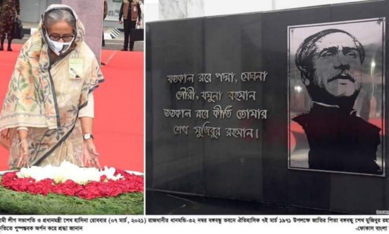 ঐতিহাসিক ৭ মার্চ উপলক্ষে জাতির পিতা বঙ্গবন্ধু শেখ মুজিবুর রহমানের প্রতিকৃতিতে ফুল দিয়ে শ্রদ্ধা জানিয়েছেন প্রধানমন্ত্রী শেখ হাসিনা। রোববার সকালে…