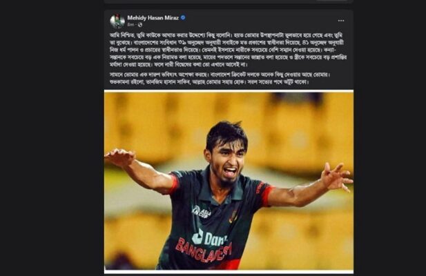 তানজিম হাসান সাকিবের সমর্থনে সামাজিক যোগাযোগমাধ্যম ফেসবুকে নিজের অফিসিয়াল পেজে একটি পোস্ট করেছিলেন মেহেদী হাসান মিরাজ। পোষ্ট করার পর ব্যাপক…